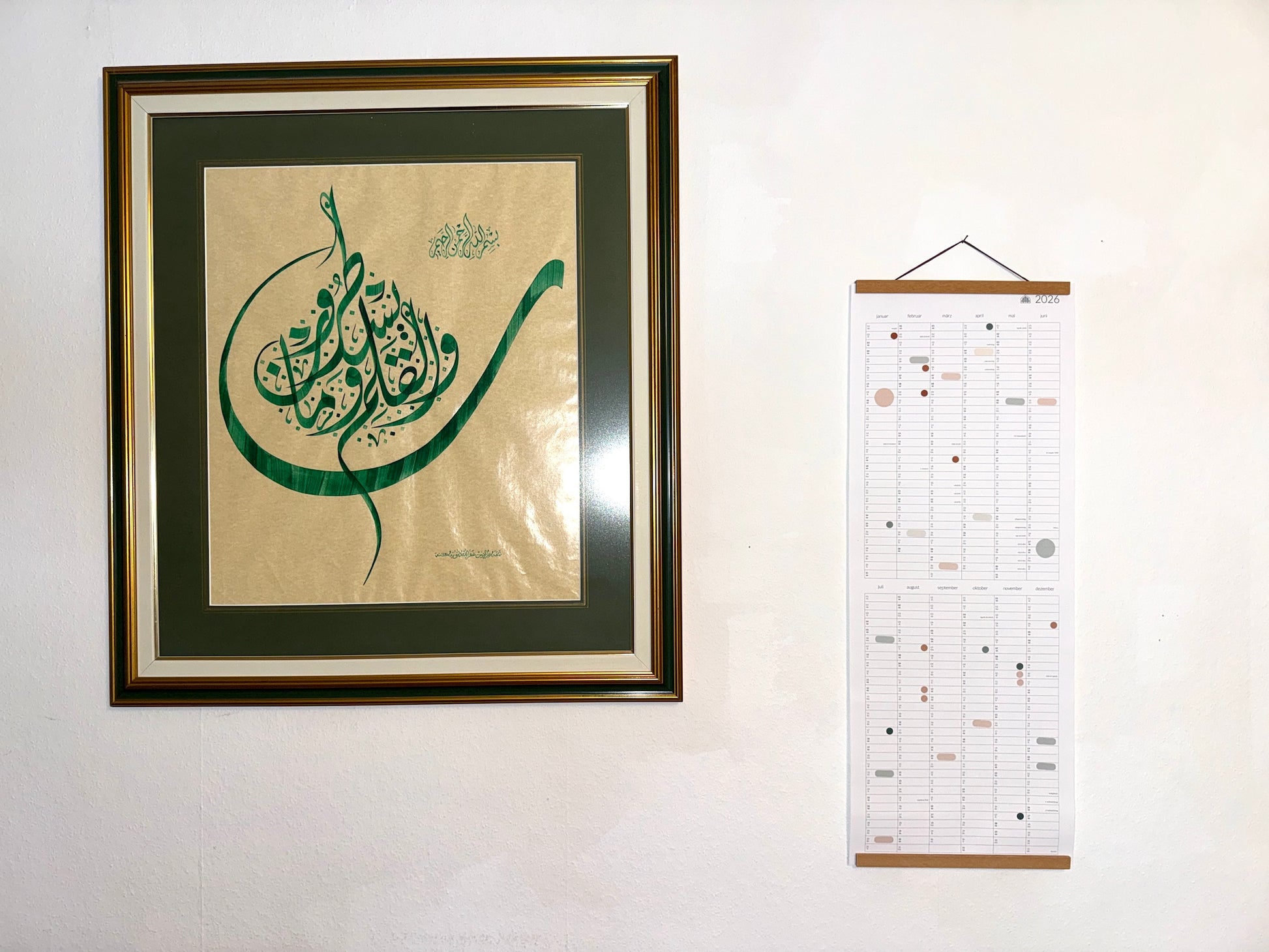 Das schlichte und zeitlose Design konzentriert sich auf die Klarheit der Kalenderdaten und die kalligrafierten Namen Allahs ta – um sich an Ihn zu erinnern, Seine Namen kennenzulernen, sie zu verstehen und sie inshaAllah zu verinnerlichen.