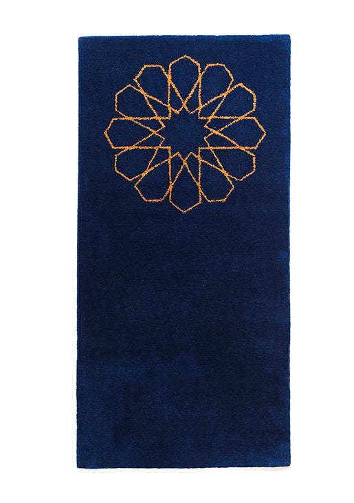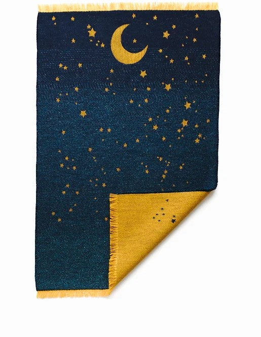 It’s tightly woven and beautiful to touch and (Besides for prayer it can be used for learning as) it shows a stellar constellation and a crescent moon on a gradient sky.