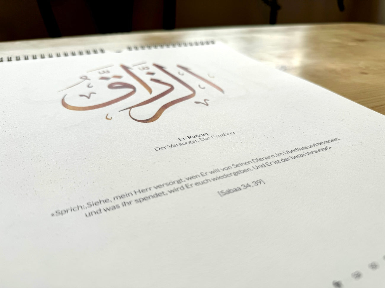 Das schlichte und zeitlose Design legt den Fokus auf die Übersichtlichkeit der Kalenderdaten und die kalligraphierten Namen Allahs t.a. – um Seiner zu gedenken, Seine Namen kennenzulernen, zu verstehen und inshaAllah zu verinnerlichen.