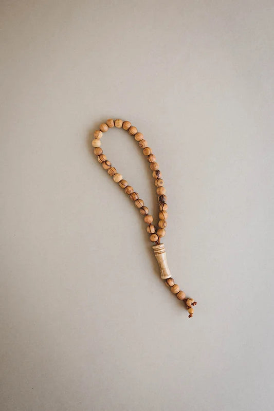 Now, we are excited to introduce our next project: prayer beads. We often get asked about the prayer beads in our photos, so we decided to make our own. We began by looking for small family manufacturers in the land of olive trees - Palestine.
